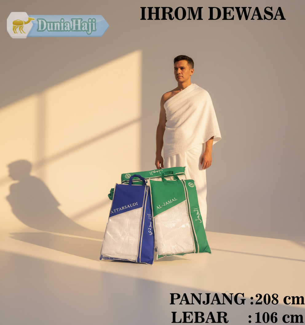Siapkan ibadah suci Anda dengan Kain Ihram Premium dari Al Jamal & Attar Saudi, dua merek terpercaya yang banyak digunakan oleh jamaah haji dan umroh.