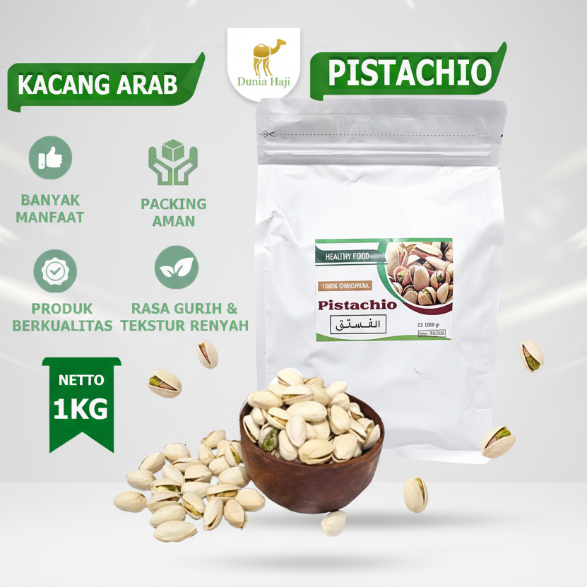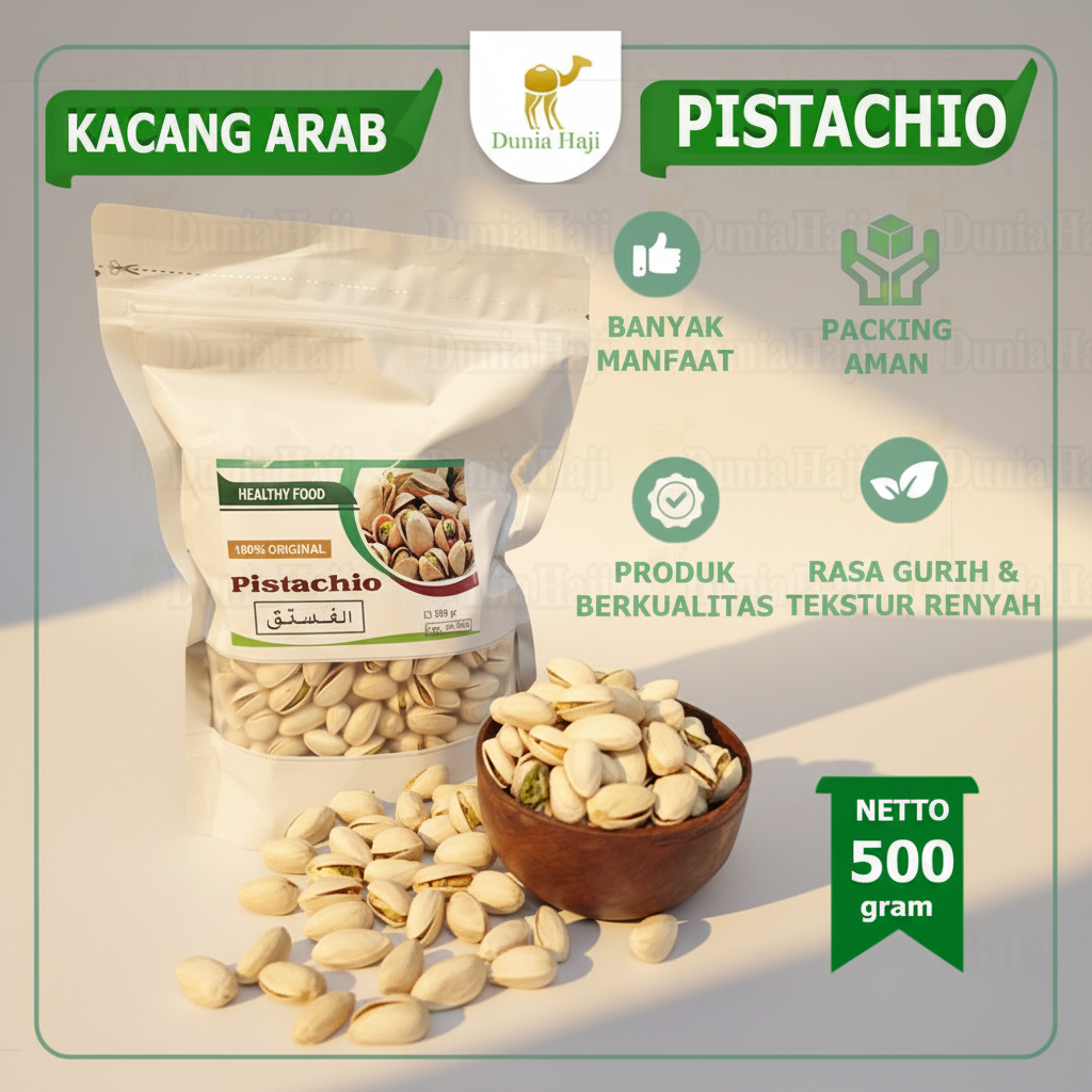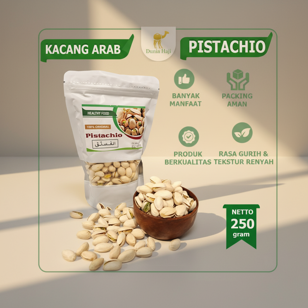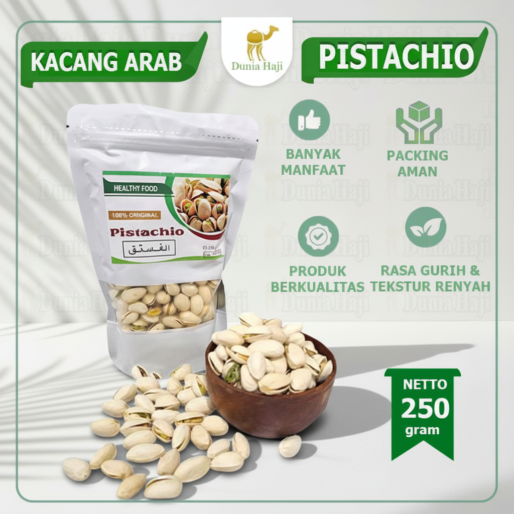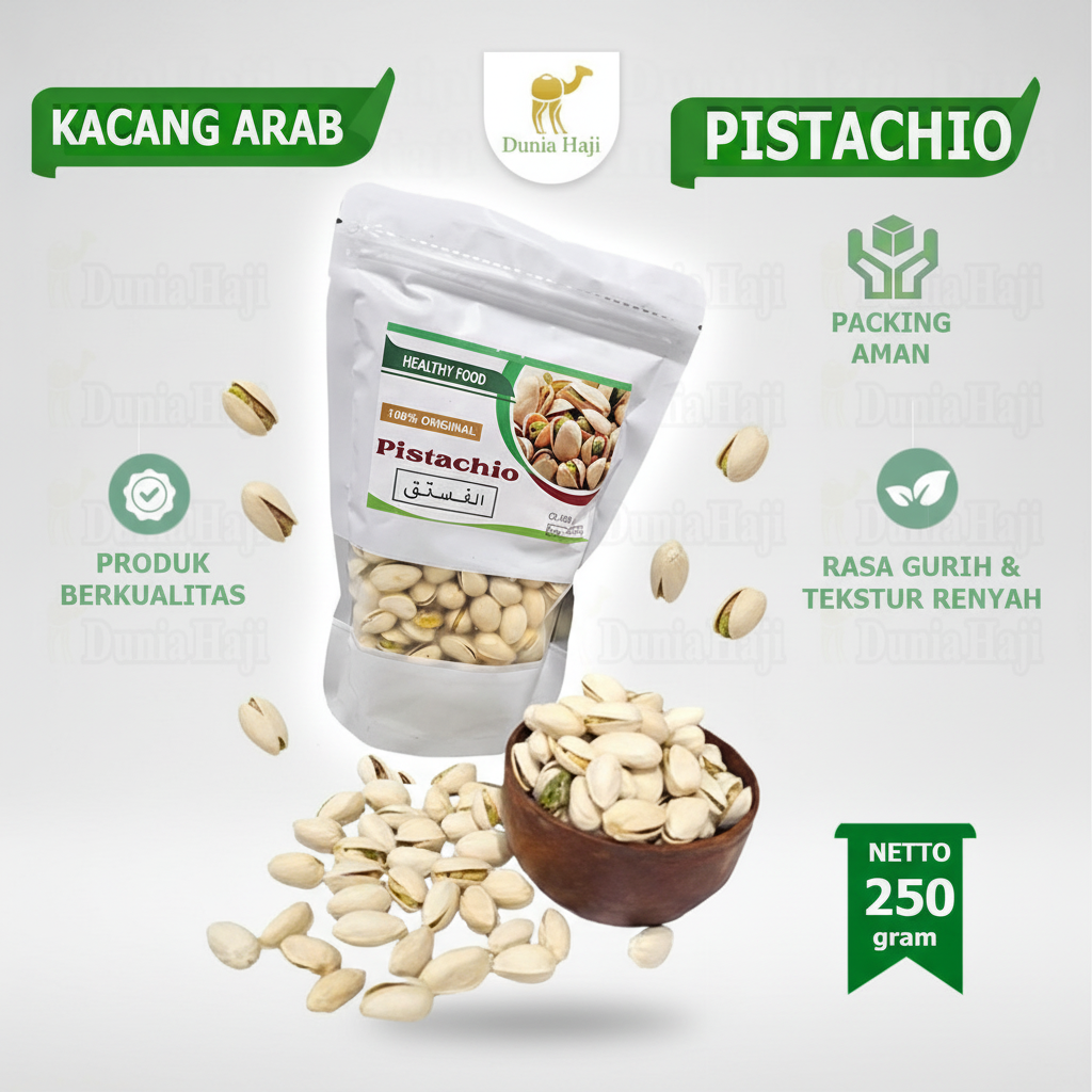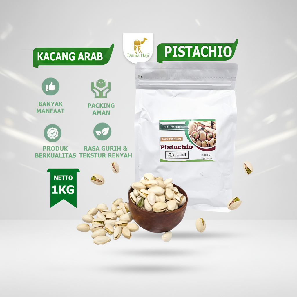 Kaya akan protein, serat, vitamin E, dan lemak baik, kacang pistachio sangat populer sebagai camilan sehat, pendamping kopi atau teh, serta oleh-oleh bergizi dari DUNIAHAJI.