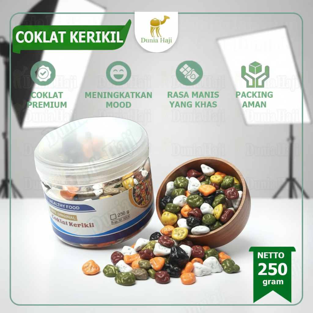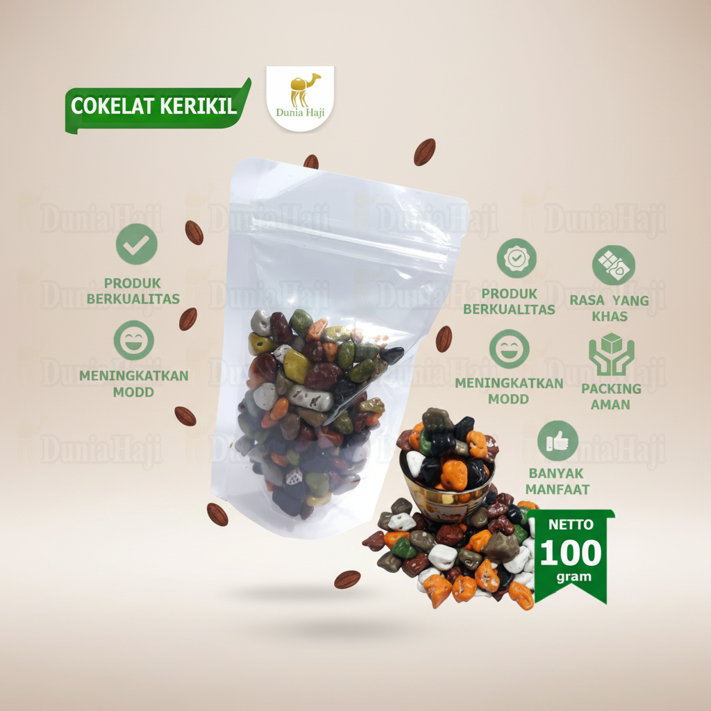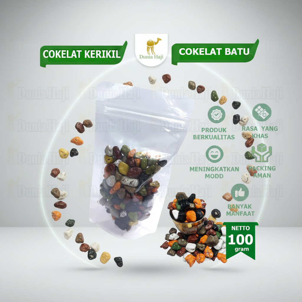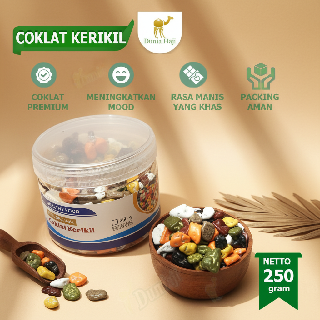 Dibuat dari cokelat berkualitas tinggi, dikemas higienis, dan cocok untuk berbagai kesempatan — dari camilan harian, suguhan tamu, hingga oleh-oleh haji & umrah yang berkesan.