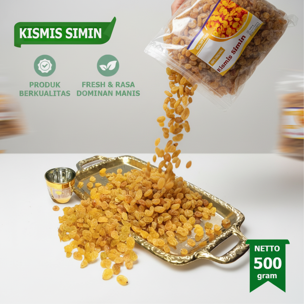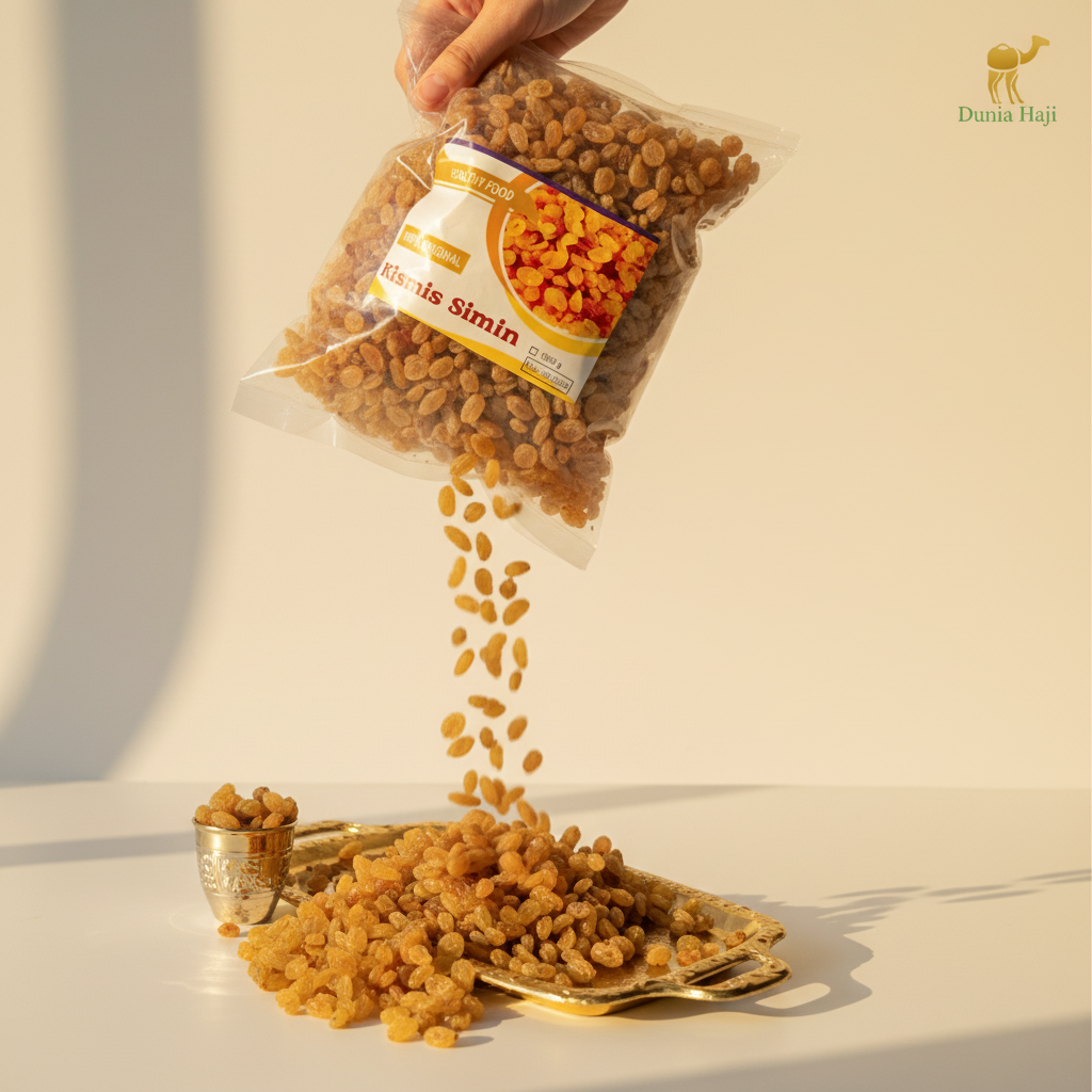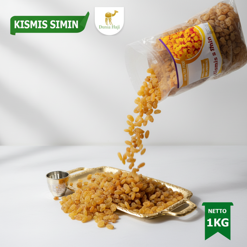 Kismis Simin dikenal sebagai kismis khas Timur Tengah dengan warna cokelat keemasan, rasa manis lembut, dan sering dijadikan pelengkap menu sehat, topping makanan, atau oleh-oleh haji & umrah.