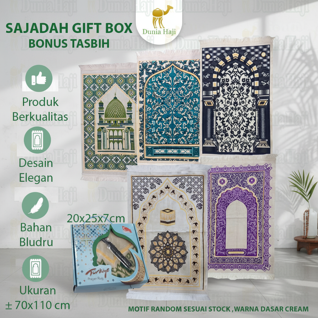 Berikan hadiah penuh makna dengan Sajadah Gift Box Premium, sajadah mewah berbahan bludru bulu lembut yang nyaman dipakai dan berdesain elegan khas Turki.