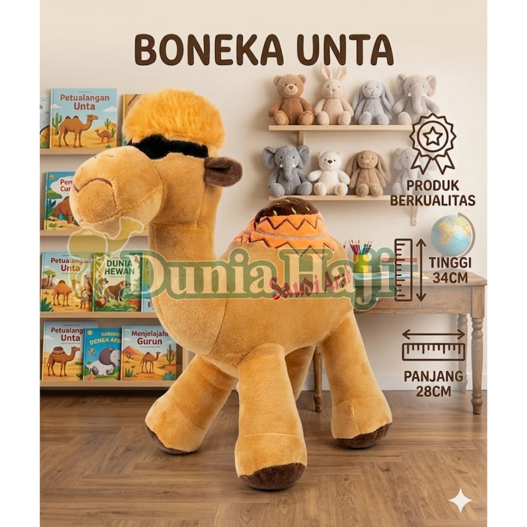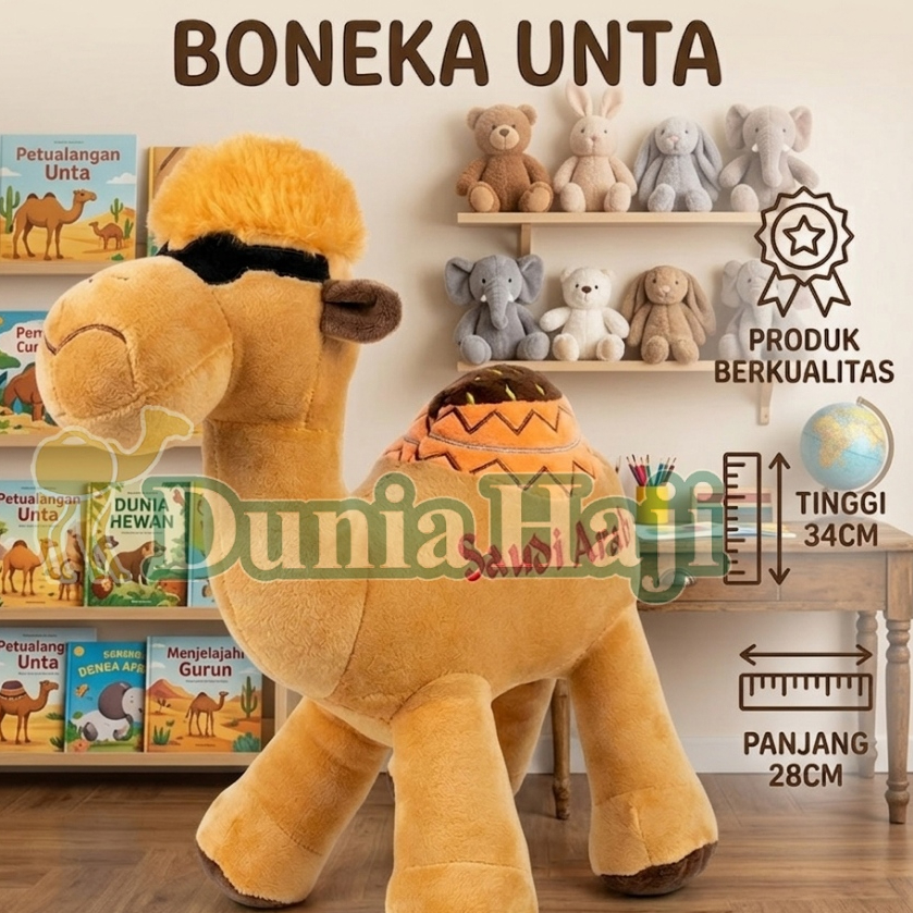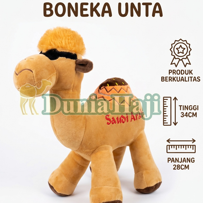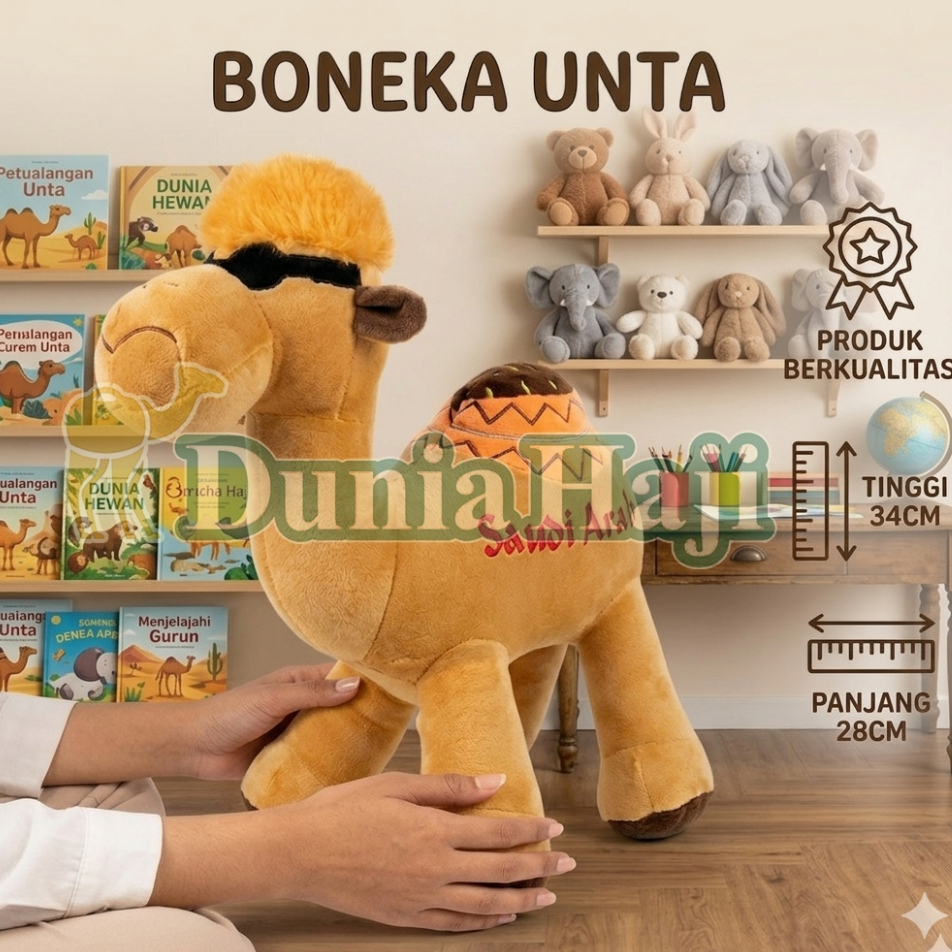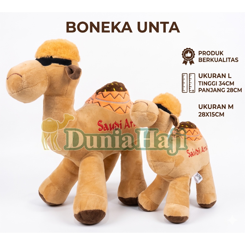 <p>BONEKA UNTA SAUDI ARABIA - Premium & Authentic</p><p>Bawa pulang kenangan manis dari Tanah Suci dengan Boneka Unta Saudi Arabia kami! Didesain dengan detail yang menggemaskan, boneka ini sangat cocok dijadikan oleh-oleh haji/umroh, kado spesial, atau dekorasi unik di rumah Anda.</p><p>Kenapa Harus Memiliki Boneka Ini?</p><p>Kualitas Premium: Terbuat dari bahan bulu halus yang lembut di kulit dan isian kapas sintetis berkualitas tinggi yang empuk.</p><p>Desain Ikonik: Dilengkapi dengan aksesoris kacamata hitam yang stylish dan bordir tulisan "Saudi Arabia" yang khas.</p><p>Aman untuk Anak: Sudah berlabel SNI, sehingga aman dimainkan oleh anak-anak.</p><p>Tersedia dalam 2 Ukuran: Anda bisa memilih ukuran yang sesuai dengan kebutuhan koleksi Anda.</p><p>Spesifikasi Produk:</p><p>Fitur </p><p>1. Ukuran L (Besar)</p><p> Tinggi34 cm28 cm </p><p></p><p>2. Ukuran M (Sedang)</p><p> Panjang28 cm15 cm</p><p></p><p> Hadiah: Sangat cocok untuk kado ulang tahun atau apresiasi anak.</p><p> Oleh-oleh: Solusi praktis bagi Anda yang ingin memberikan buah tangan khas Arab tanpa harus menenteng dari jauh.</p><p>Dekorasi: Mempercantik rak buku atau sudut ruangan dengan nuansa Timur Tengah.</p>