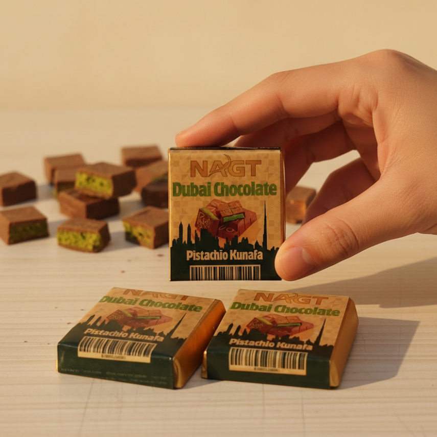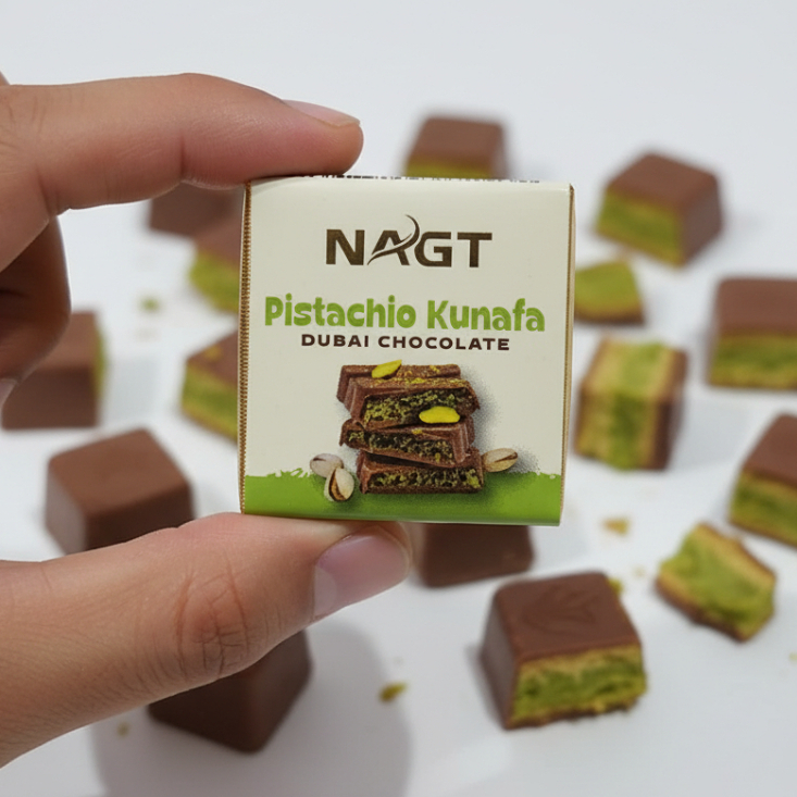 Nikmati sensasi manis yang mewah dengan Pistachio Kunafa Chocolate, coklat premium khas Dubai yang viral dan digemari pecinta dessert Timur Tengah. Hadir dengan perpaduan unik antara dark chocolate premium, pistachio yang lembut dan rich, serta kunafa renyah yang memberikan tekstur istimewa di setiap gigitan.