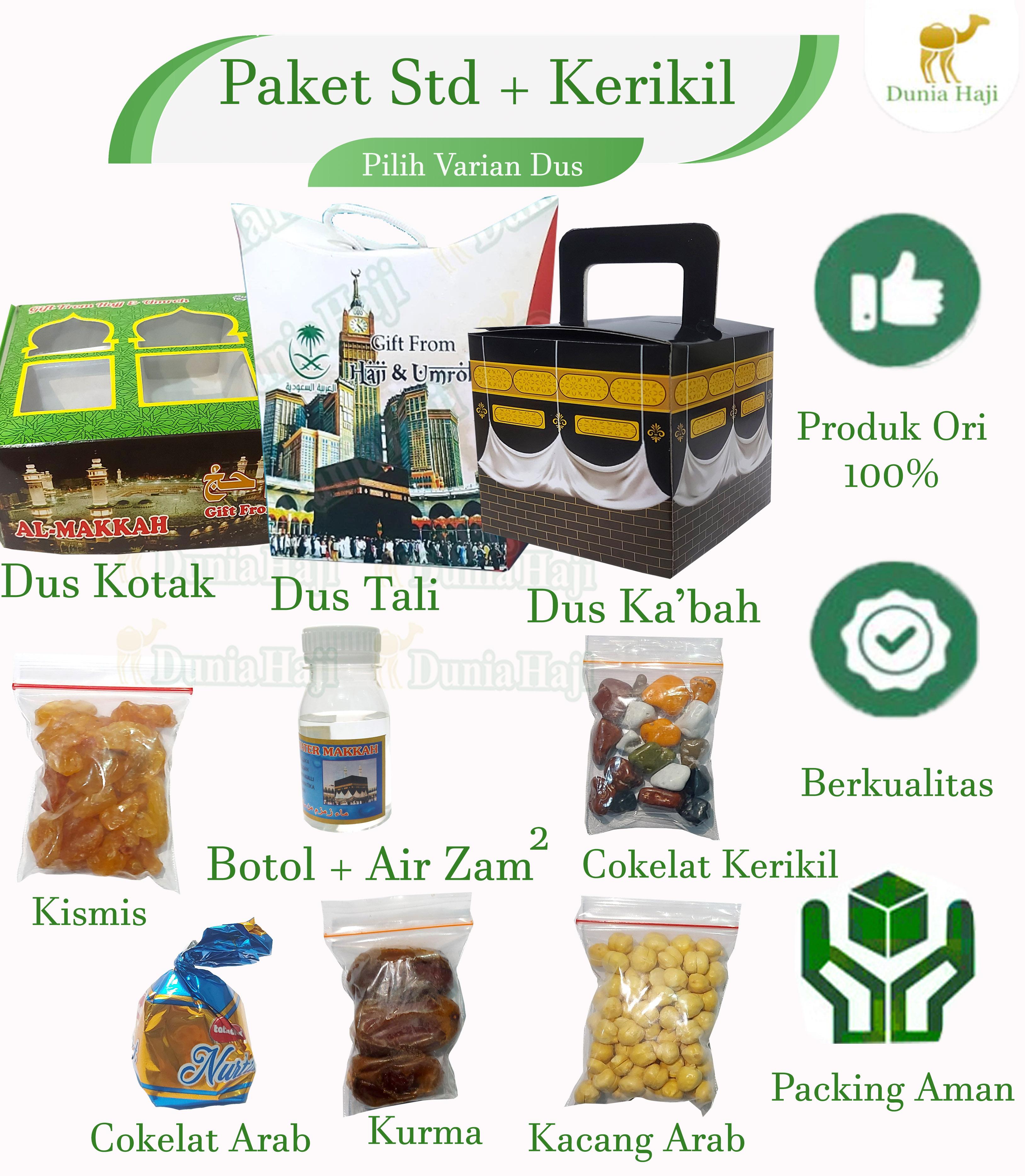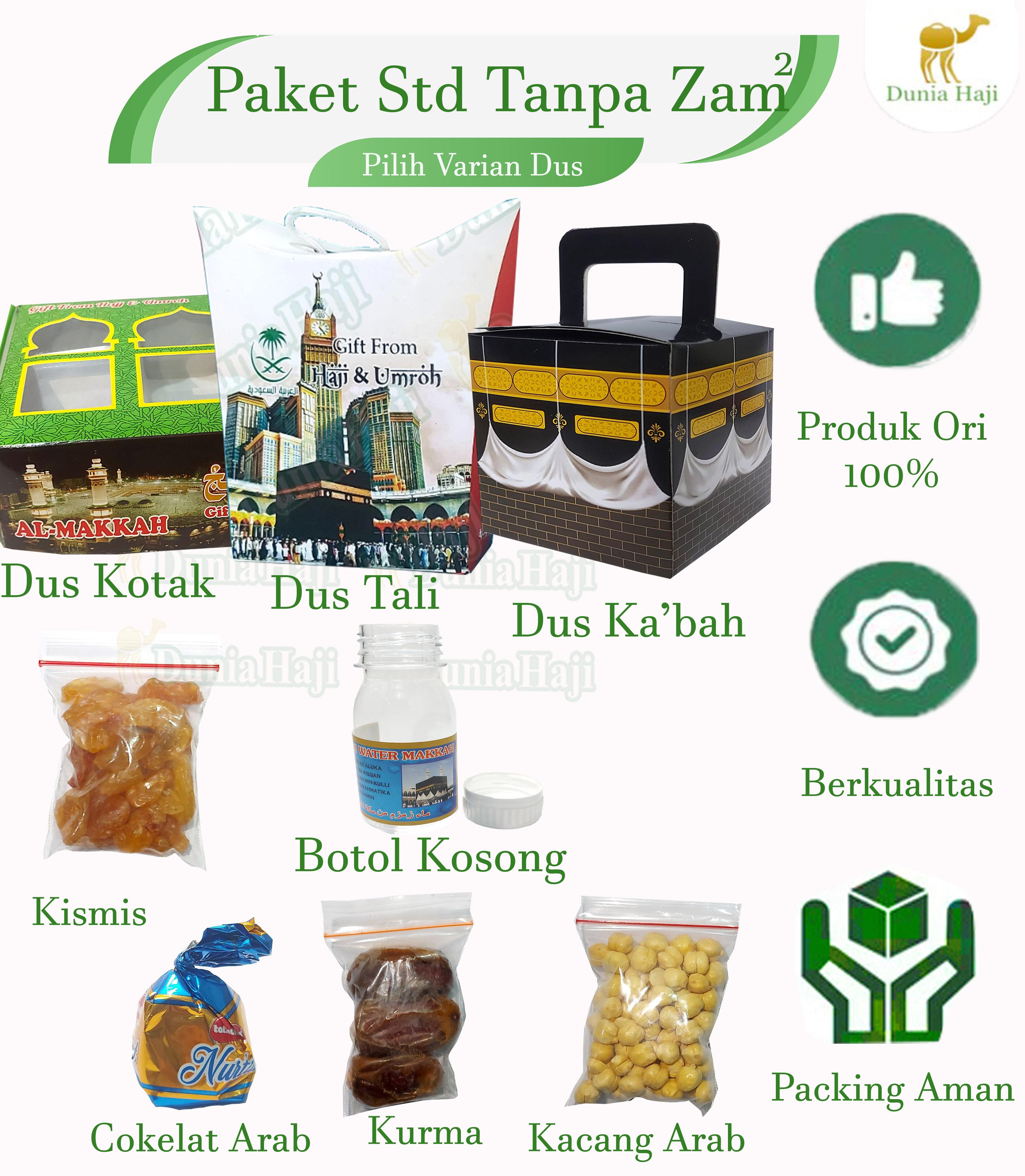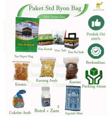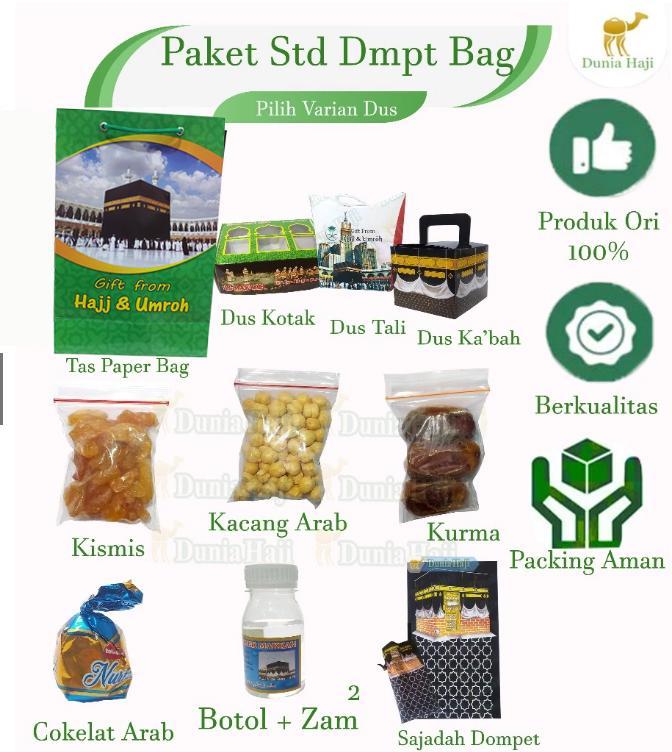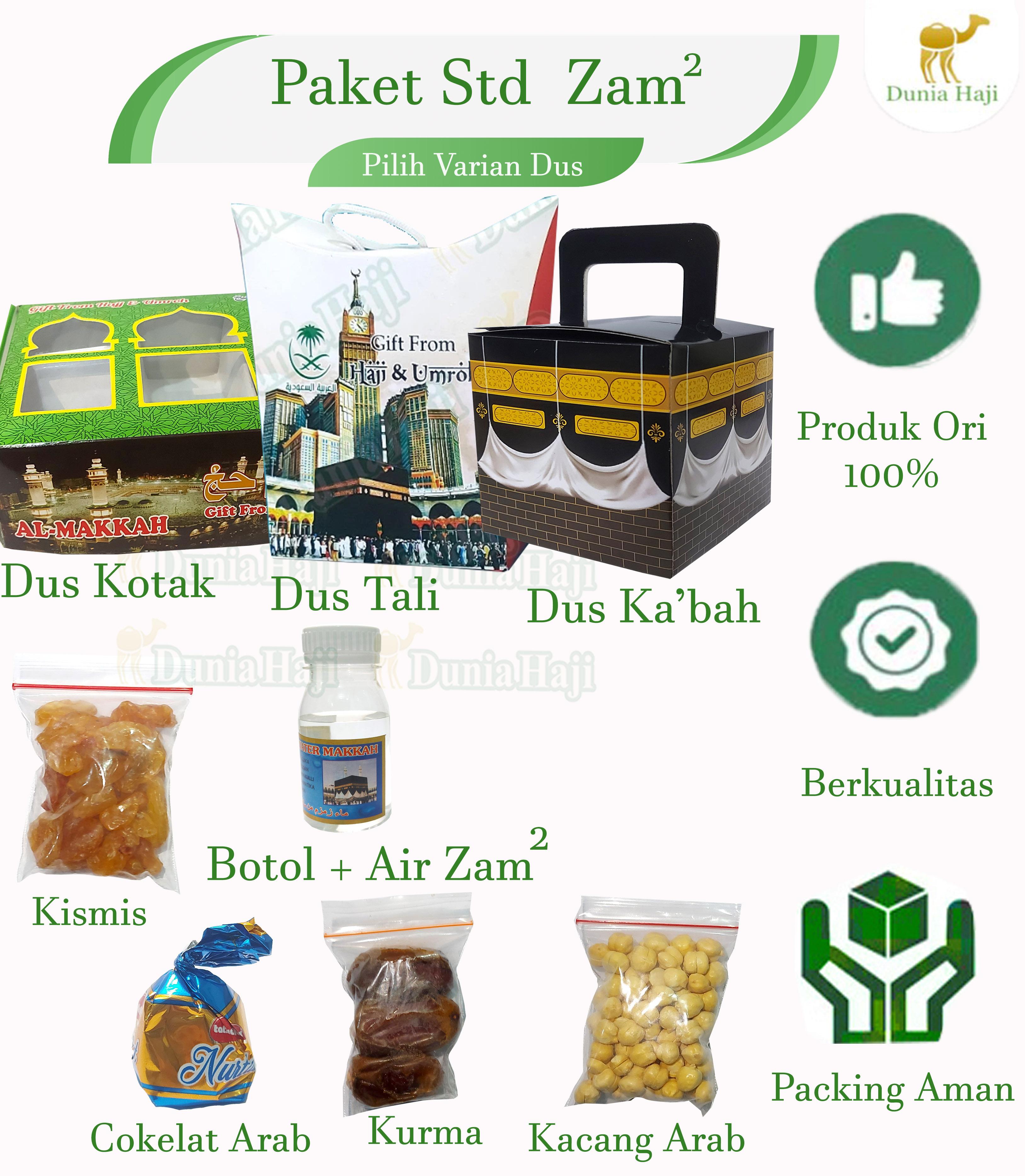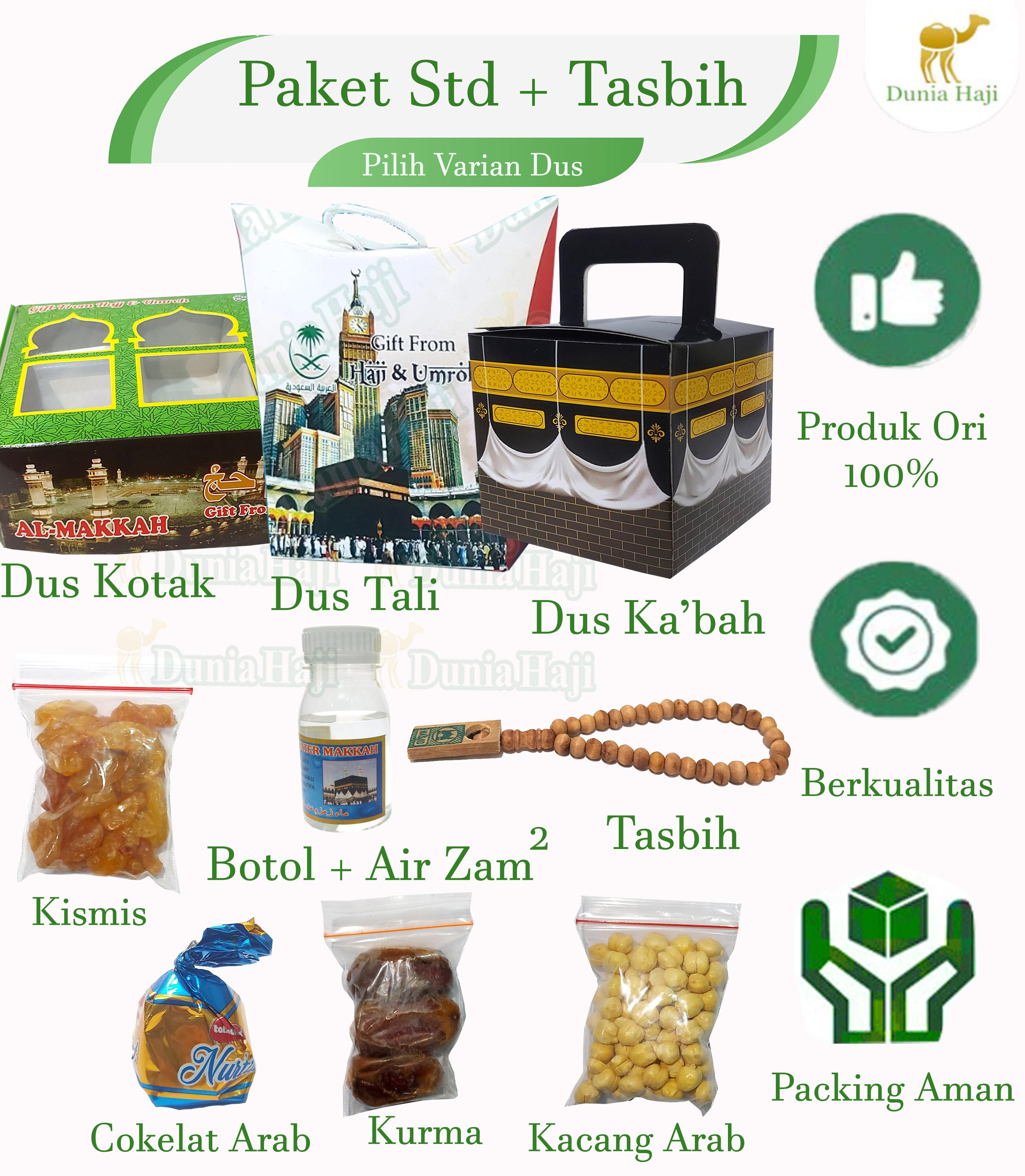 <p>**Deskripsi Produk: Paket Oleh-Oleh Haji Paket Hemat 50PCS Ekonomis dan Lengkap**<br/>Bawa pulang kenangan istimewa dari tanah suci dengan **Paket Oleh-Oleh Haji** kami! Tersedia dalam berbagai varian dus yang elegan dan isi produk pilihan khas Timur Tengah. Cocok untuk buah tangan, hadiah, atau koleksi pribadi.<br/>### **Varian Dus:**<br/>1. **Dus Kotak** – Desain klasik dengan kemasan kokoh, memberikan kesan mewah.<br/>2. **Dus Tali** – Stylish dengan tali pengikat, praktis dan aesthetic.<br/>3. **Dus Kabah** – Bentuk unik menyerupai Kabah, simbolik dan bernilai religi.<br/>### **Isi Produk Pilihan:**<br/>### **Isi Produk Pilihan Varian:**<br/>1. STD BOTOL KOSONG ( dus pilih varian )<br/>- **Kismis** – Manis alami, kaya nutrisi.<br/>- **Kacang Arab** – Gurih renyah, camilan sehat.<br/>- **Cokelat Arab** – Lembut dengan rasa khas kurma atau kacang.<br/>- **Kurma** – manis dan berkualitas.<br/>- ** Botol kosong tanpa air zam zam<br/>2. STD ZAM ( dus pilih varian )<br/>**Kismis** – Manis alami, kaya nutrisi.<br/>- **Kacang Arab** – Gurih renyah, camilan sehat.<br/>- **Cokelat Arab** – Lembut dengan rasa khas kurma atau kacang.<br/>- **Kurma** – manis dan berkualitas.<br/>** Botol DENGAN Air Zam-Zam<br/>3. STD + KERIKIL ( dus pilih varian )<br/>**Kismis** – Manis alami, kaya nutrisi.<br/>- **Kacang Arab** – Gurih renyah, camilan sehat.<br/>- **Cokelat Arab** – Lembut dengan rasa khas kurma atau kacang.<br/>- **Kurma** – manis dan berkualitas.<br/>** Botol DENGAN Air Zam-Zam<br/>- ** Cokelat Kerikil<br/>4. STD + TASBIH ( dus pilih varian )<br/>**Kismis** – Manis alami, kaya nutrisi.<br/>- **Kacang Arab** – Gurih renyah, camilan sehat.<br/>- **Cokelat Arab** – Lembut dengan rasa khas kurma atau kacang.<br/>- **Kurma** – manis dan berkualitas.<br/>** Botol DENGAN Air Zam-Zam<br/>- **Tasbih** – Kayu 33 butir<br/>5. STD+DMPT+BAG ( dus pilih varian )<br/>**Kismis** – Manis alami, kaya nutrisi.<br/>- **Kacang Arab** – Gurih renyah, camilan sehat.<br/>- **Cokelat Arab** – Lembut dengan rasa khas kurma atau kacang.<br/>- **Kurma** – manis dan berkualitas.<br/>** Botol DENGAN Air Zam-Zam<br/>- ** Sajadah Dompet Traveling 50x100cm<br/>- ** Paper Bag ( warna sesuai stock )<br/>6. STD+RAYON+BAG ( warnasesuai stock )<br/>**Kismis** – Manis alami, kaya nutrisi.<br/>- **Kacang Arab** – Gurih renyah, camilan sehat.<br/>- **Cokelat Arab** – Lembut dengan rasa khas kurma atau kacang.<br/>- **Kurma** – manis dan berkualitas.<br/>** Botol DENGAN Air Zam-Zam<br/>- ** Sajadah MIni 35 x 60 cm<br/>- ** Paper Bag ( warna sesuai stock )<br/><br/><br/>Bisa pilih varian paket haji sesuai dengan kebutuhan<br/>demi keamanan produk maka paket belum dibentuk atau dimasukkan kedalam dus.<br/></p>