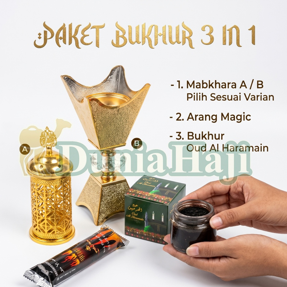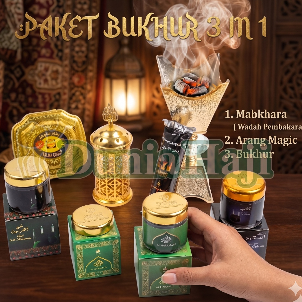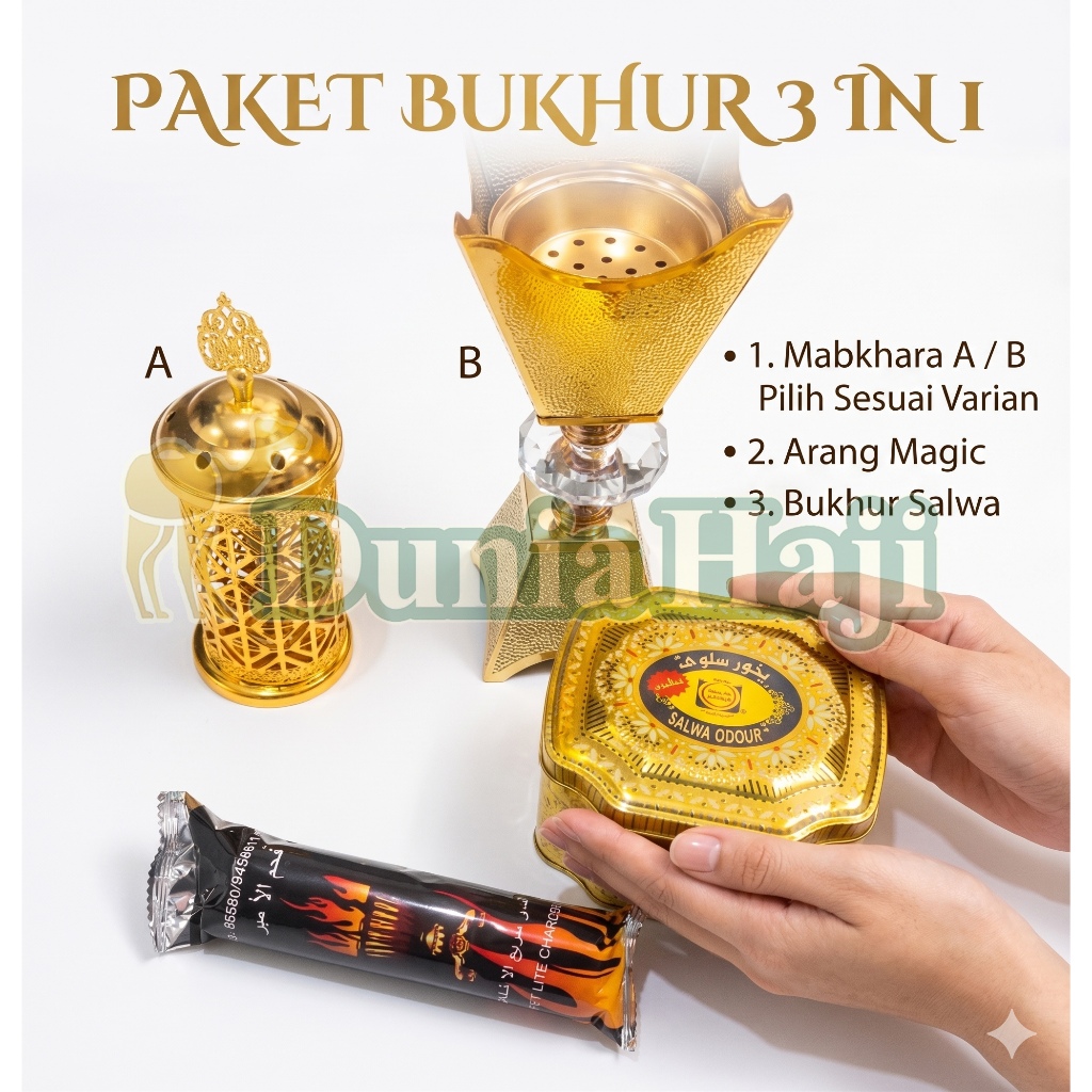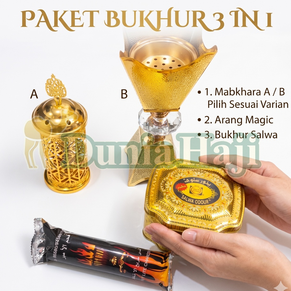 <p>PAKET BUKHUR 3 IN 1 - Paket Hemat Ritual Wewangian Premium</p><p>Hadirkan suasana tenang, religius, dan mewah di dalam rumah Anda dengan Paket Bukhur 3 in 1. Paket lengkap ini dirancang khusus untuk Anda yang menginginkan kemudahan dalam membakar bukhur tanpa harus membeli perlengkapan secara terpisah. Sangat cocok untuk pengharum ruangan, acara majelis, atau hadiah (hampers) untuk orang terkasih.</p><p>Apa yang Anda dapatkan dalam paket ini?</p><p>1x Mabkhara (Prapen/Wadah Pembakar):</p><p>Wadah pembakaran dengan desain estetik dan mewah berwarna emas (gold).</p><p>Material tahan panas dan kokoh, memberikan kesan elegan di sudut ruangan.</p><p>1 Roll Arang Magic (Isi 10 keping):</p><p>Arang praktis yang sangat mudah menyala (sekali sundut api langsung merambat).</p><p>Tanpa bau menyengat dan tahan lama.</p><p>1 Jar Bukhur Premium (Pilih Varian Favorit Anda):</p><p>Salwa: Aroma bunga yang lembut dan menenangkan.</p><p>Ar Raudah: Aroma khas Masjid Nabawi yang bikin rindu suasana Madinah.</p><p>Oud Al Haramain: Aroma kayu gaharu yang kuat, mewah, dan berkelas.</p><p>Abeer Al Qiswa: Wangi khas kain Ka'bah yang manis dan sakral.</p><p></p><p>Kenapa Harus Memilih Paket Ini?</p><p>Praktis & Lengkap: Tidak perlu bingung lagi, paket datang langsung siap pakai.</p><p>Kualitas Premium: Serbuk bukhur asli dengan ketahanan aroma yang lama.</p><p>Multifungsi: Menghilangkan bau tidak sedap, menciptakan suasana relaksasi, dan sunnah dalam mengharumkan ruangan.</p><p>Desain Mewah: Mabkhara emas menambah kesan dekoratif yang cantik.</p><p>Cara Penggunaan:</p><p>Siapkan Mabkhara dan letakkan satu keping Arang Magic di atasnya.</p><p>Bakar pinggiran arang menggunakan korek api hingga muncul percikan api (arang akan merambat sendiri).</p><p>Tunggu hingga arang menjadi bara/memutih sedikit.</p><p>Letakkan sedikit serbuk Bukhur di atas bara arang.</p><p>Nikmati aroma mewah yang mulai menyebar ke seluruh ruangan.</p><p>Stok Terbatas! Segera miliki Paket Bukhur 3 in 1 ini untuk suasana rumah yang lebih berkah dan wangi.</p><p>#Bukhur #Mabkhara #PaketBukhur #PengharumRuangan #Sunnah #ArangMagic #OudHaramain #ArRaudah #WewangianArab</p>