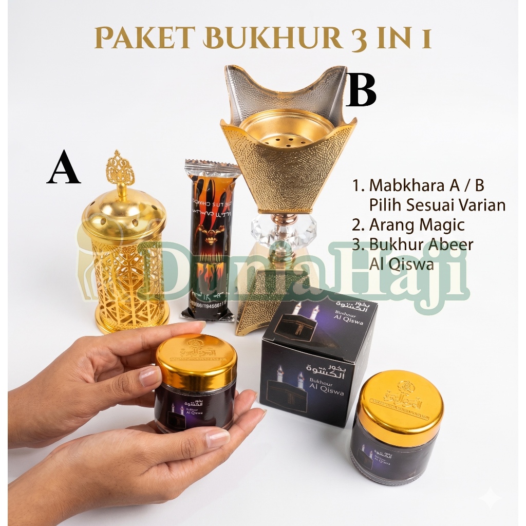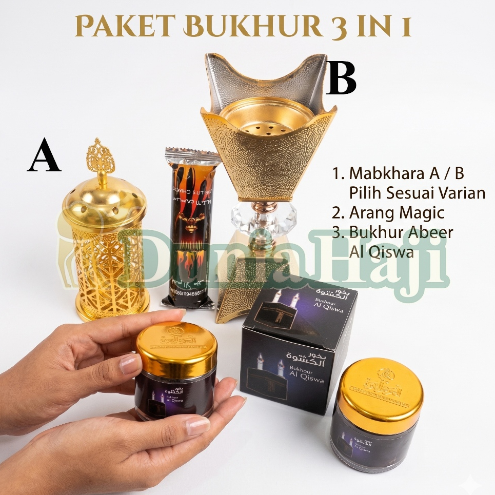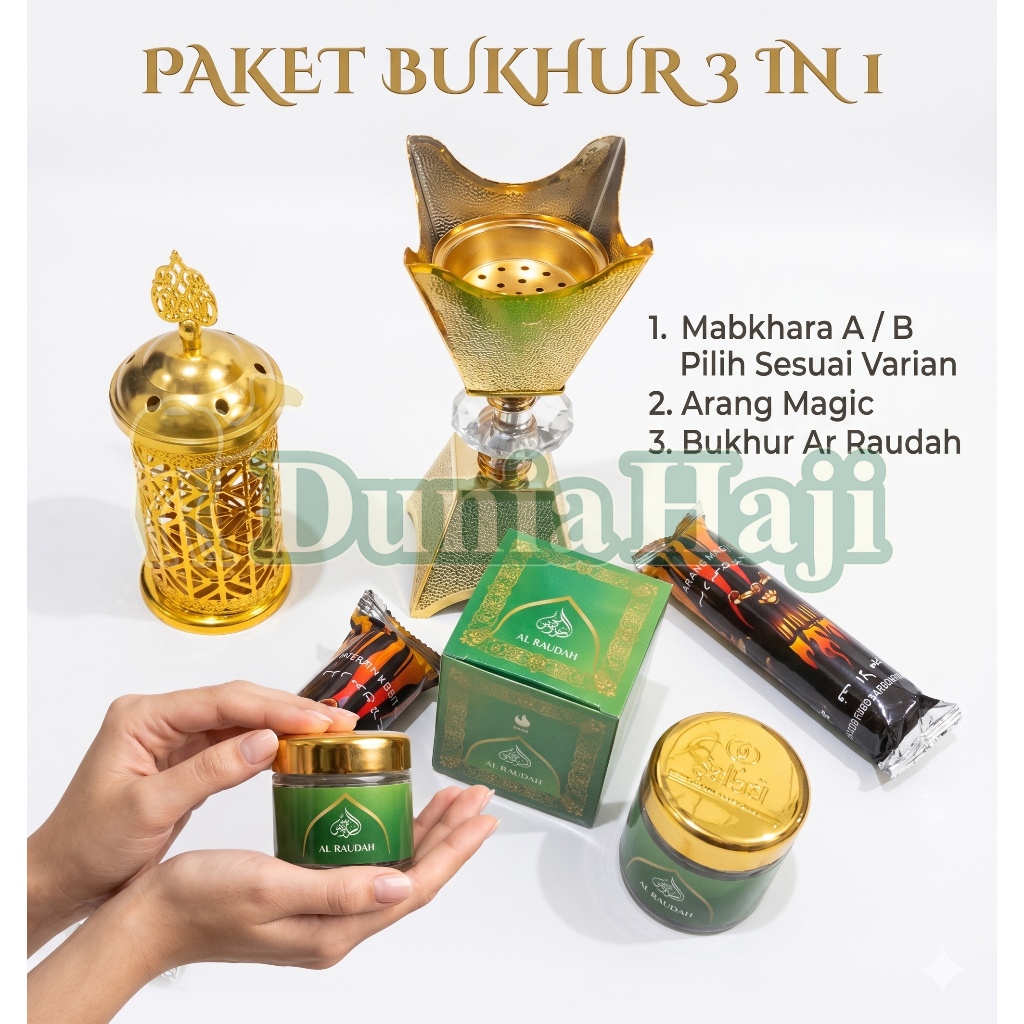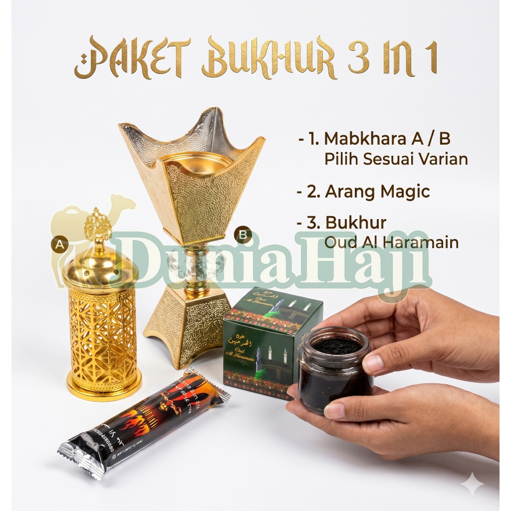 <p>PAKET BUKHUR 3 IN 1 - Paket Hemat Ritual Wewangian Premium</p><p>Hadirkan suasana tenang, religius, dan mewah di dalam rumah Anda dengan Paket Bukhur 3 in 1. Paket lengkap ini dirancang khusus untuk Anda yang menginginkan kemudahan dalam membakar bukhur tanpa harus membeli perlengkapan secara terpisah. Sangat cocok untuk pengharum ruangan, acara majelis, atau hadiah (hampers) untuk orang terkasih.</p><p>Apa yang Anda dapatkan dalam paket ini?</p><p>1x Mabkhara (Prapen/Wadah Pembakar):</p><p>Wadah pembakaran dengan desain estetik dan mewah berwarna emas (gold).</p><p>Material tahan panas dan kokoh, memberikan kesan elegan di sudut ruangan.</p><p>1 Roll Arang Magic (Isi 10 keping):</p><p>Arang praktis yang sangat mudah menyala (sekali sundut api langsung merambat).</p><p>Tanpa bau menyengat dan tahan lama.</p><p>1 Jar Bukhur Premium (Pilih Varian Favorit Anda):</p><p>Salwa: Aroma bunga yang lembut dan menenangkan.</p><p>Ar Raudah: Aroma khas Masjid Nabawi yang bikin rindu suasana Madinah.</p><p>Oud Al Haramain: Aroma kayu gaharu yang kuat, mewah, dan berkelas.</p><p>Abeer Al Qiswa: Wangi khas kain Ka'bah yang manis dan sakral.</p><p></p><p>Kenapa Harus Memilih Paket Ini?</p><p>Praktis & Lengkap: Tidak perlu bingung lagi, paket datang langsung siap pakai.</p><p>Kualitas Premium: Serbuk bukhur asli dengan ketahanan aroma yang lama.</p><p>Multifungsi: Menghilangkan bau tidak sedap, menciptakan suasana relaksasi, dan sunnah dalam mengharumkan ruangan.</p><p>Desain Mewah: Mabkhara emas menambah kesan dekoratif yang cantik.</p><p>Cara Penggunaan:</p><p>Siapkan Mabkhara dan letakkan satu keping Arang Magic di atasnya.</p><p>Bakar pinggiran arang menggunakan korek api hingga muncul percikan api (arang akan merambat sendiri).</p><p>Tunggu hingga arang menjadi bara/memutih sedikit.</p><p>Letakkan sedikit serbuk Bukhur di atas bara arang.</p><p>Nikmati aroma mewah yang mulai menyebar ke seluruh ruangan.</p><p>Stok Terbatas! Segera miliki Paket Bukhur 3 in 1 ini untuk suasana rumah yang lebih berkah dan wangi.</p><p>#Bukhur #Mabkhara #PaketBukhur #PengharumRuangan #Sunnah #ArangMagic #OudHaramain #ArRaudah #WewangianArab</p>