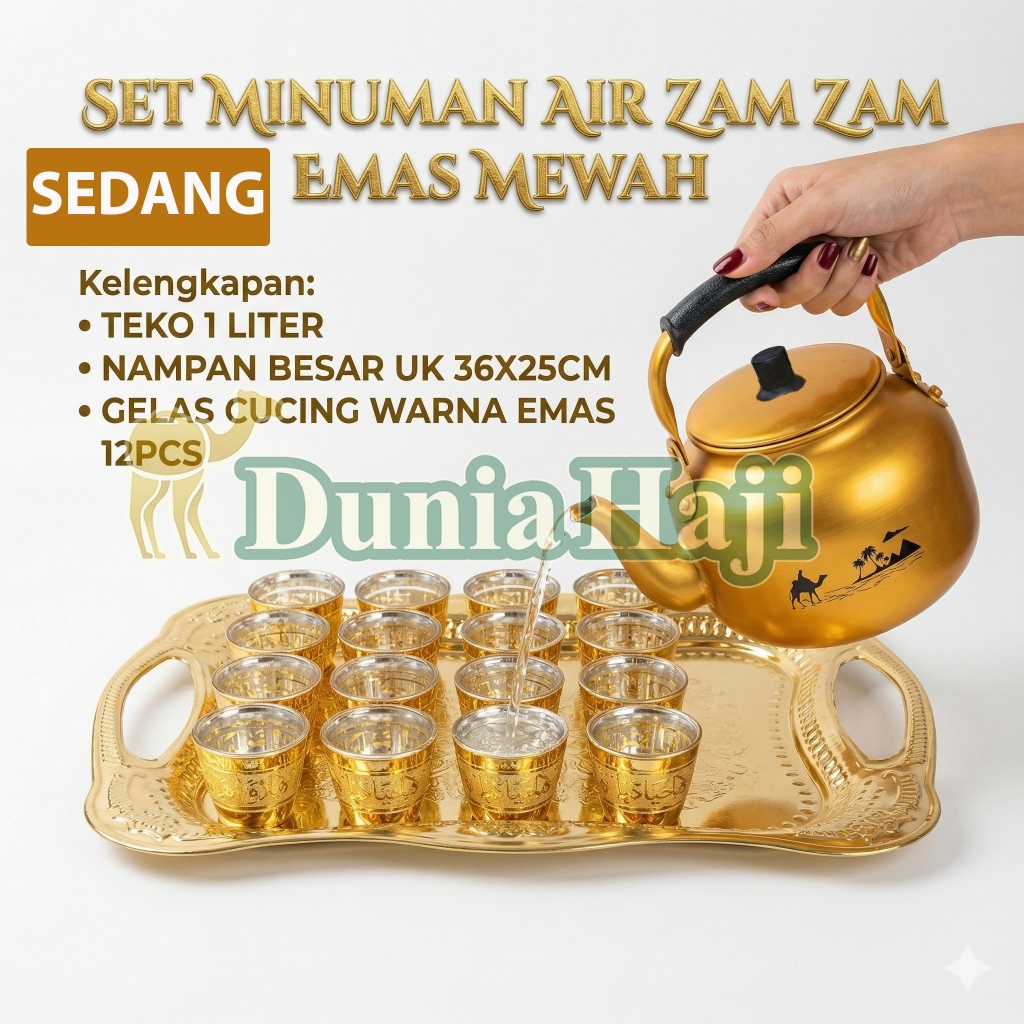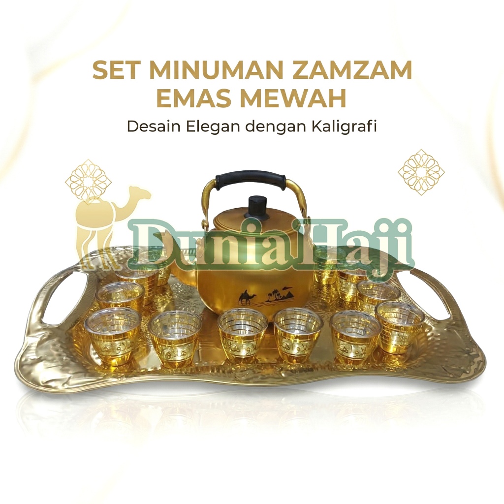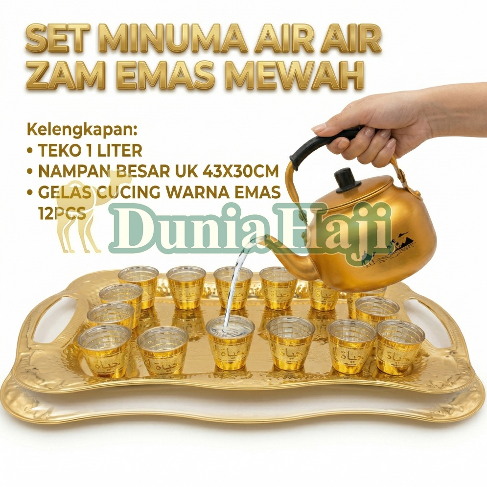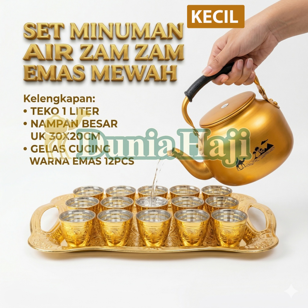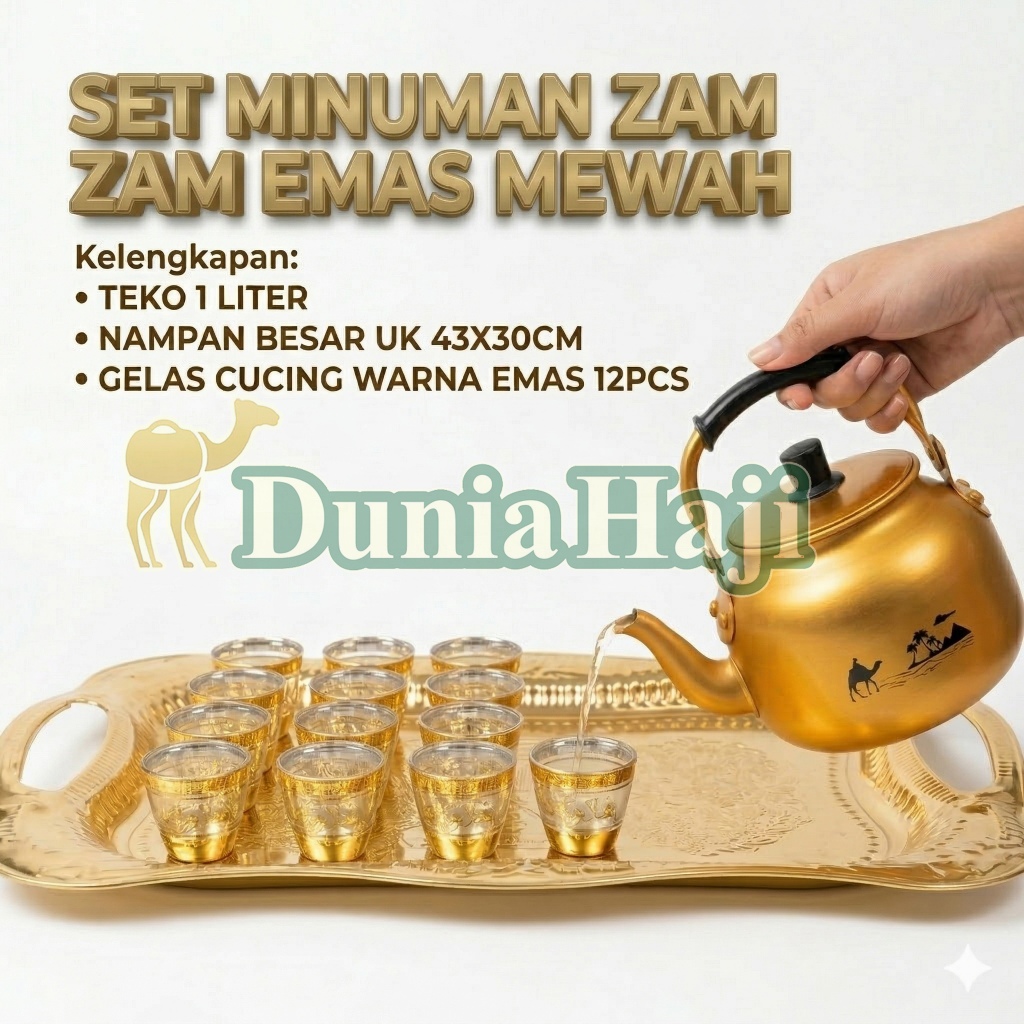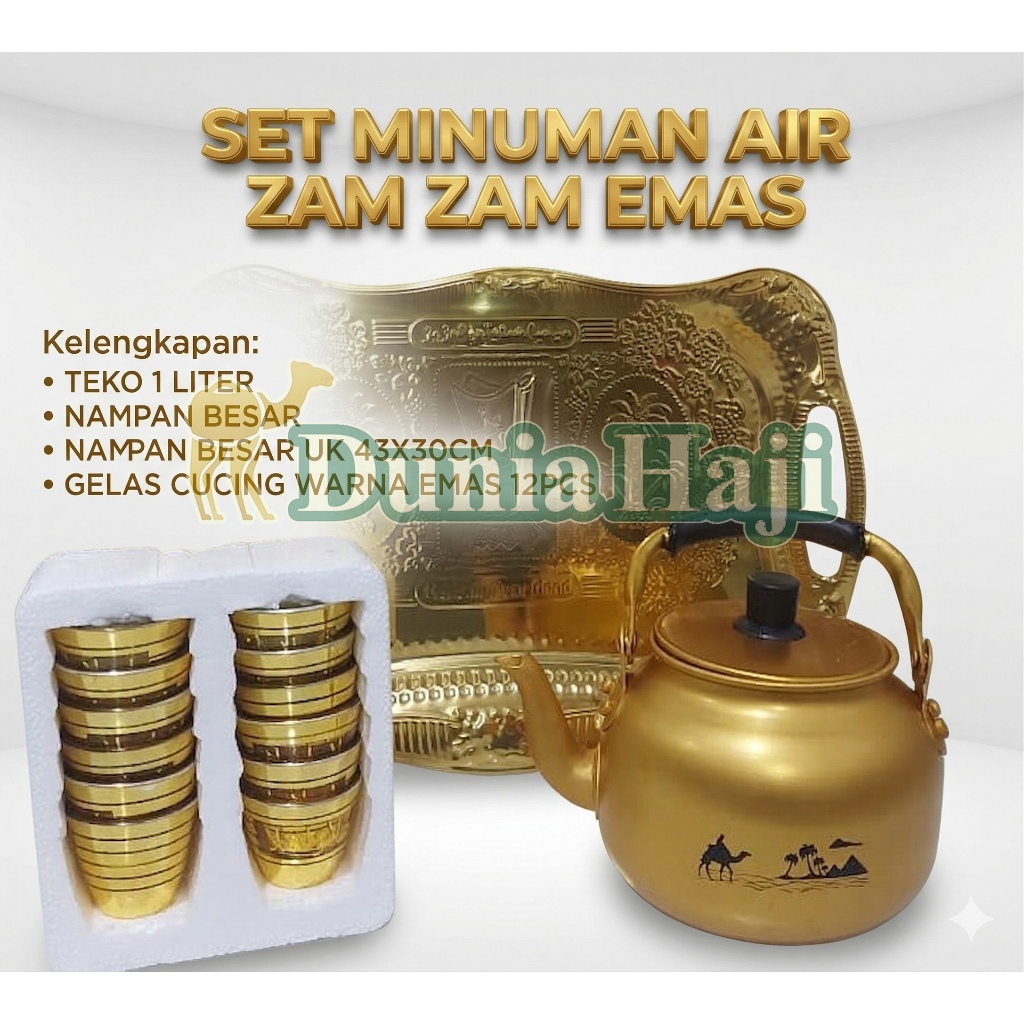 <p>SET MINUMAN AIR ZAM-ZAM EMAS MEWAH (14-in-1)</p><p>Hadirkan nuansa premium dan elegan di rumah Anda dengan Set Minuman Air Zam-Zam Emas Mewah. Didesain khusus dengan perpaduan warna emas yang berkilau dan motif khas Timur Tengah, set ini sangat cocok digunakan untuk menyajikan air Zam-Zam bagi tamu spesial, hadiah umroh/haji, maupun sebagai dekorasi ruang tamu yang estetik.</p><p>Keunggulan Produk:</p><p>Desain Eksklusif: Warna emas satin yang memberikan kesan mewah dan berkelas.</p><p>Motif Khas: Teko dihiasi dengan grafir siluet unta dan pohon kurma yang otentik.</p><p>Material Berkualitas: Tahan lama, mudah dibersihkan, dan aman untuk penggunaan harian.</p><p>Paket Lengkap: Sudah termasuk nampan dan 12 buah gelas cucing cantik.</p><p>Kelengkapan dalam Paket Besar :</p><p>1 Unit Teko Premium: Kapasitas 1 Liter, pas untuk penyajian yang efisien.</p><p>1 Unit Nampan Besar: Ukuran 43 x 30 cm, cukup luas untuk menata seluruh gelas dengan rapi.</p><p>12 Pcs Gelas Cucing: Gelas kecil dengan aksen emas yang serasi dengan teko.</p><p></p><p>Kelengkapan dalam Paket Sedang</p><p>1 Unit Teko Premium: Kapasitas 1 Liter, pas untuk penyajian yang efisien.</p><p>1 Unit Nampan Besar: Ukuran 36 x 25 cm, cukup luas untuk menata seluruh gelas dengan rapi.</p><p>12 Pcs Gelas Cucing: Gelas kecil dengan aksen emas yang serasi dengan teko.</p><p></p><p>Kelengkapan dalam Paket kecil</p><p>1 Unit Teko Premium: Kapasitas 1 Liter, pas untuk penyajian yang efisien.</p><p>1 Unit Nampan Kecil: Ukuran 30 x 20 cm, cukup luas untuk menata seluruh gelas dengan rapi.</p><p>12 Pcs Gelas Cucing: Gelas kecil dengan aksen emas yang serasi dengan teko.</p><p></p><p>Sangat Cocok Untuk:</p><p>Oleh-oleh Haji & Umroh.</p><p>Penyajian Air Zam-Zam saat hari raya atau pengajian.</p><p>Hantaran/Seserahan pernikahan.</p><p>Koleksi pajangan rumah bergaya Arab/Timur Tengah.</p>